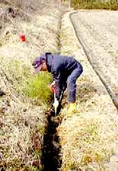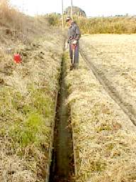 ■堀はらいとは、田んぼへ入る水路の土砂やゴミを取り除いたり、草を削り取って水を流れやすくする作業です。ほとんどの田んぼはU字溝が整備され、手入れが楽になりましたが、冬の間に落ち葉やゴミがたまりますので、掃除をしなければなりません。