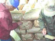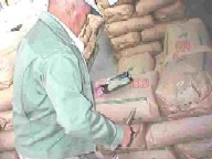 ●集荷したお米を写真のように一袋づつ刺して米を抜き取ります。1回の検査で1000袋から1500袋の米を検査します。