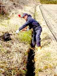 ■堀はらいとは、田んぼへ入る水路の土砂やゴミを取り除いたり、草を削り取って水を流れやすくする作業です。ほとんどの田んぼはU字溝が整備され、手入れが楽になりましたが、冬の間に落ち葉やゴミがたまりますので、掃除をしなければなりません。